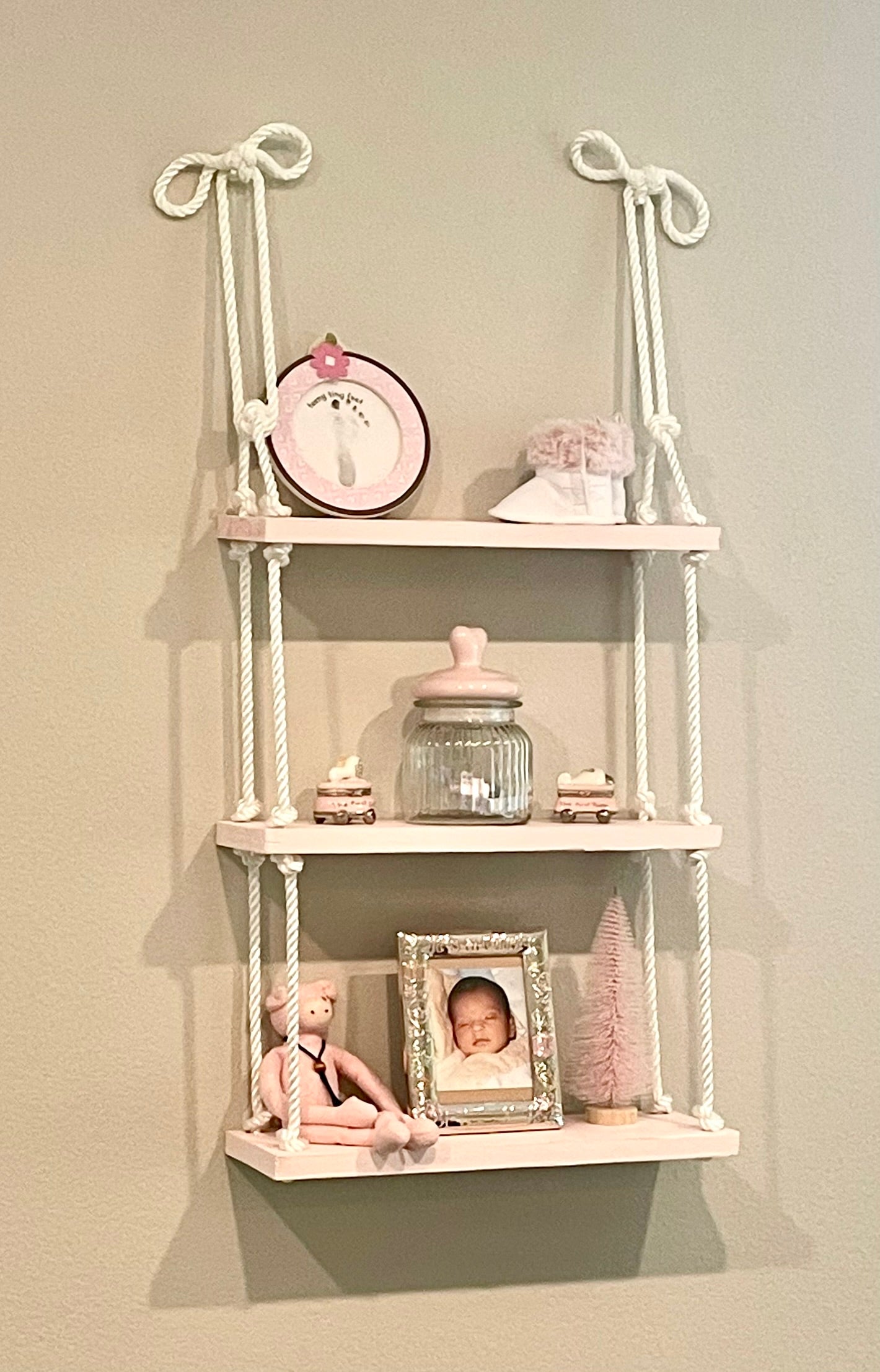 Display precious baby memories with these pink shelves with white rope. Perfect for a playful touch in any baby's bedroom, these shelves are ideal for showcasing keepsakes and trinkets, such as a framed ultrasound, hospital bracelets, 1st tooth and hair snippet, foot and/or handprints, baby's adorable photo etc.